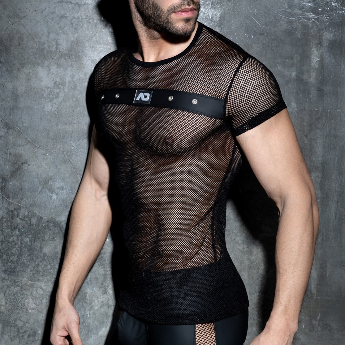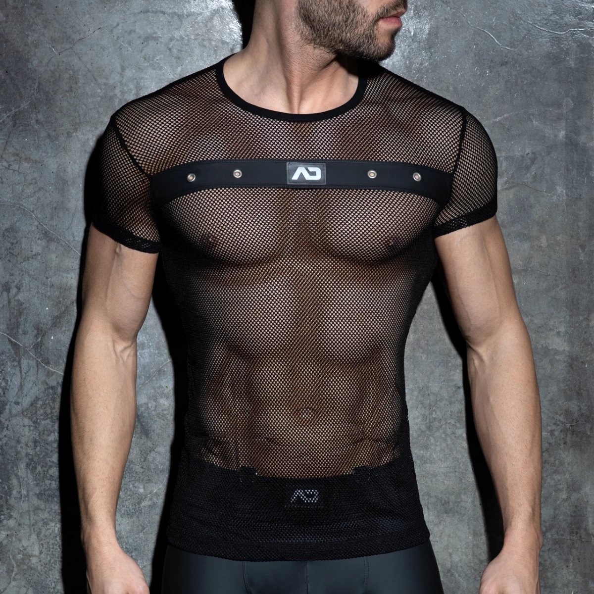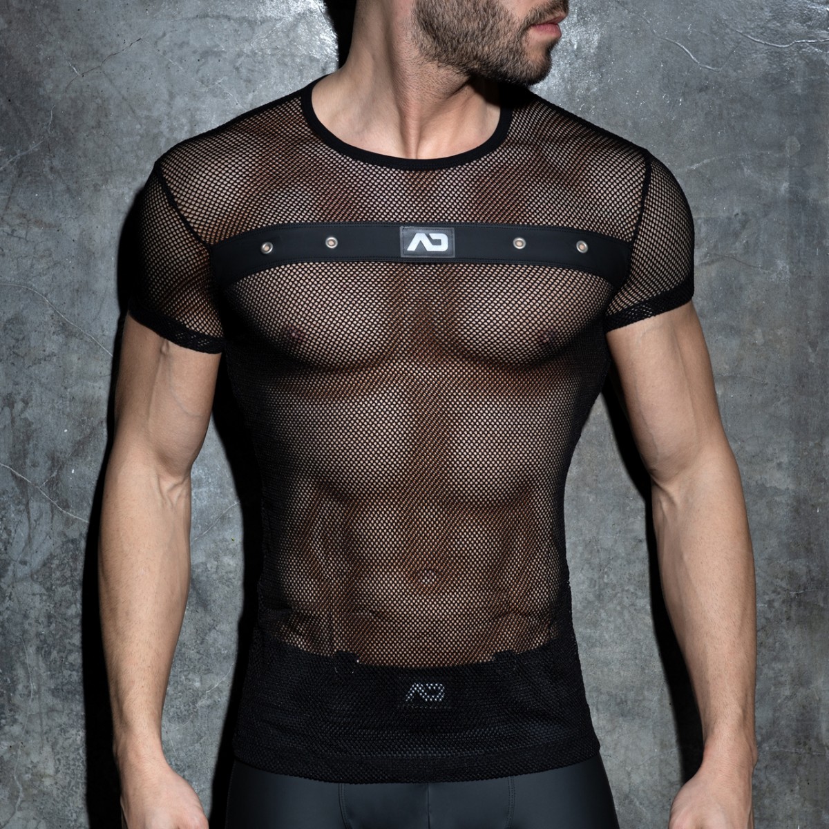 Fetish T-shirt made of mesh fabric. Rubber band on the front with metal holes and AD silcone logo on the front.