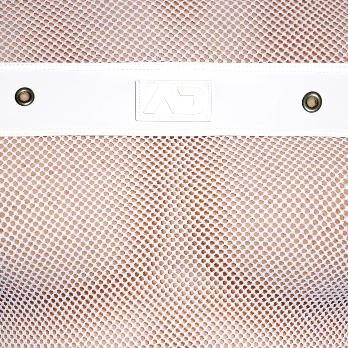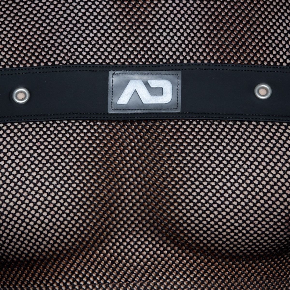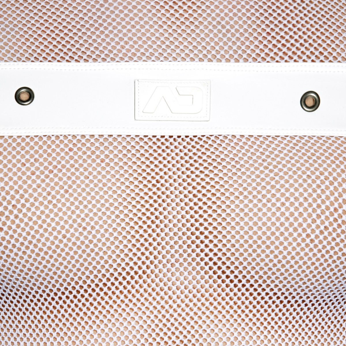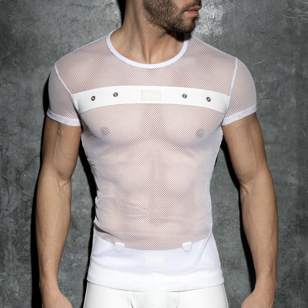 Fetish T-shirt made of mesh fabric. Rubber band on the front with metal holes and AD silcone logo on the front.
